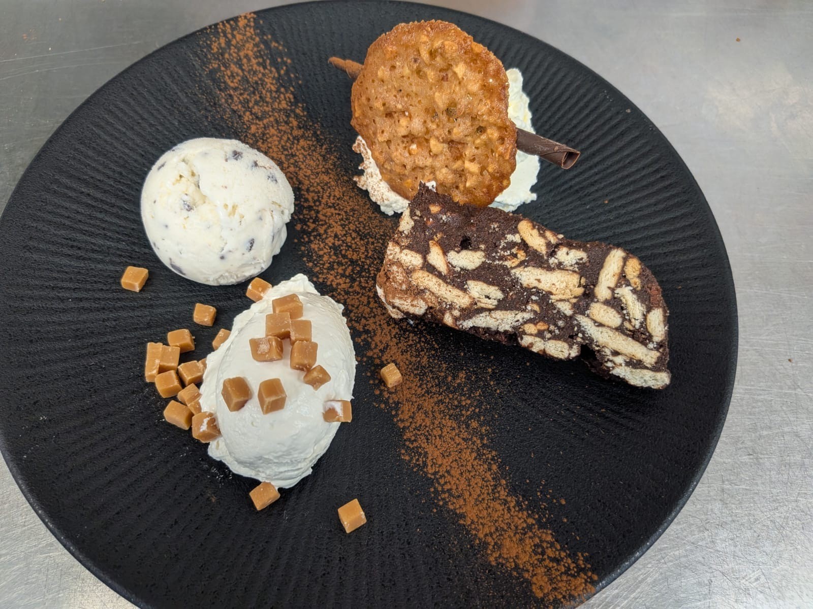 Roomboter | cacao | biscuits | stracciatella-roomijs | witte chocolademousse | caramel | slagroom | kletskop 9,50